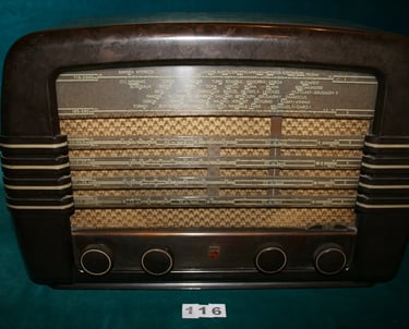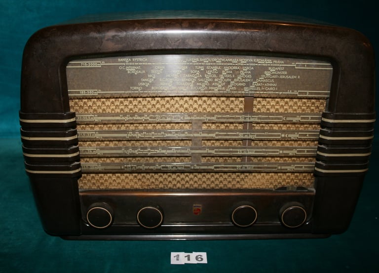 Philips’in 1950’lerde Hollanda’da ürettiği bu çok bantlı lambalı radyo, uzun, orta ve birden fazla kısa dalga bandı ile dönemin uluslararası yayınlarını dinlemek için geliştirilmiştir. Geniş cam skalası ve art déco tasarımı, Philips’in savaş sonrası dönem estetiğinin tipik bir örneğidir.