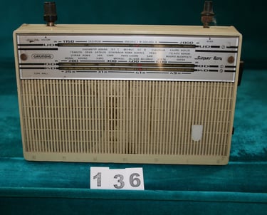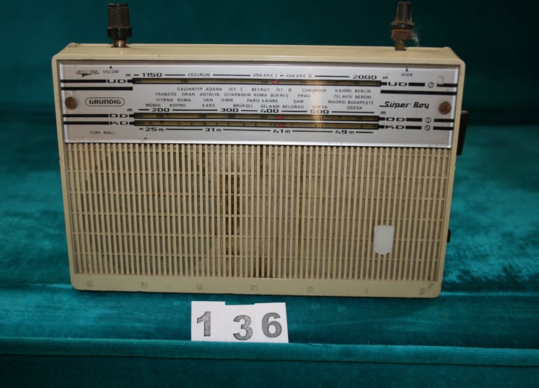 Grundig Süper Boy, 1960’larda Türkiye’de radyo dinleme kültürünün yaygınlaşmasını simgeler. “Türk Malı” ibaresiyle yerel pazara sunulan bu model, Ankara’dan Erzurum’a uzanan istasyon isimleriyle radyonun ülkeyi sesle birbirine bağladığı dönemin sessiz tanığıdır.