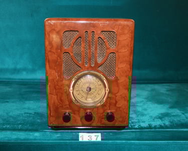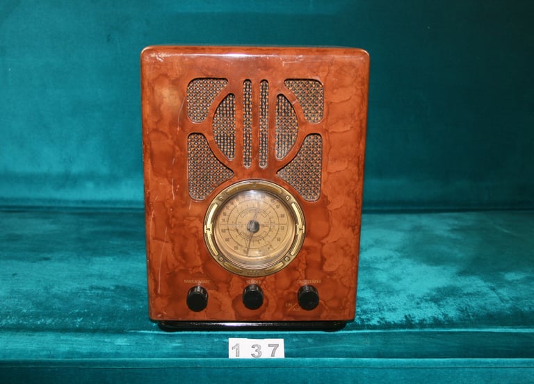 1930’ların bu bakelit lambalı radyosu, radyonun bir ev eşyası olmaktan çıkıp statü simgesine dönüştüğü dönemi yansıtır. Dairesel kadranı ve Art Deco çizgileriyle, Avrupa’da haberin, müziğin ve dünyanın eve ilk kez bu kadar estetik bir biçimde girdiği yılların sessiz tanığıdır.